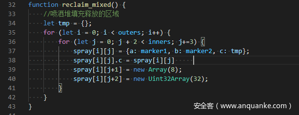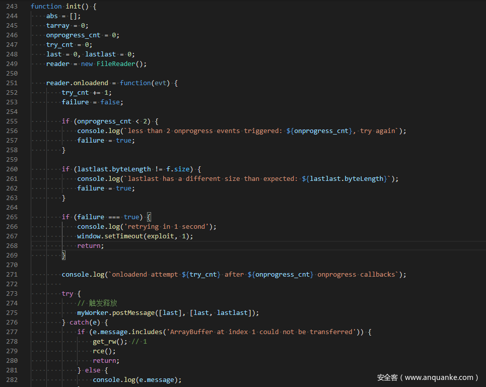调用FileReader.readAsArrayBuffer,将触发多个onprogress事件,如果事件的时间安排正确,则最后两个事件可以返回同一个ArrayBuffer。通过释放其中一个指针来释放ArrayBuffer那块内存,后面可以使用另一个悬挂指针来引用这块内存。然后通过将做好标记的JavaScript对象(散布在TypedArrays中)喷洒到堆中来填充释放的区域。
