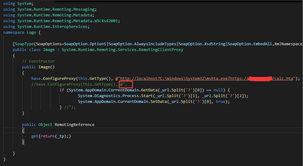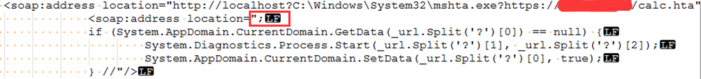 如上图的POC中所示,由于第二行的soap:address locaotion后面紧跟着一个换行符,经过上述的处理流程后,导致生成的Logo.cs文件内容如下,可以看到本该被注释掉的if (System.AppDomain…等代码并未被注释掉。