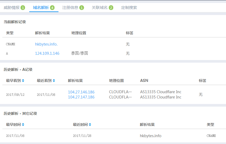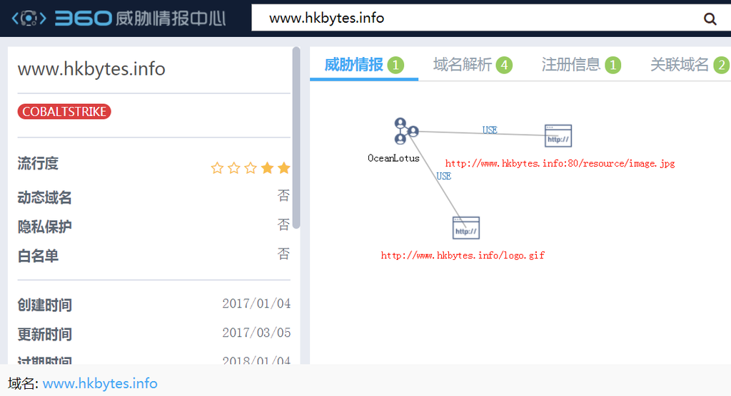 通过在360威胁情报中心搜索www.hkbytes.info该域名,如图: