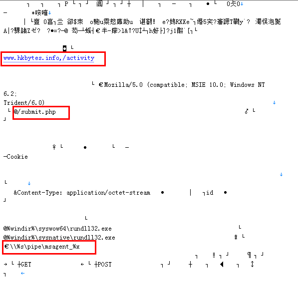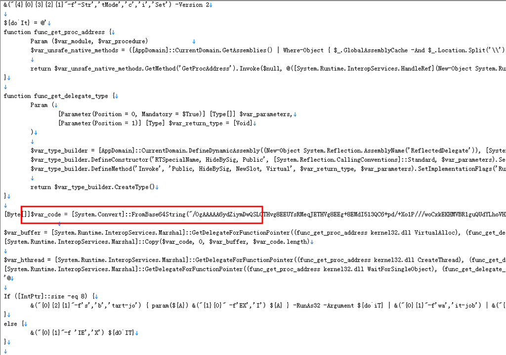 接下来程序会把传过来的string做base64解密在内存中加载执行,下图为解密后的string,很容易看出来这又是Cobalt Strike的Shellcode Payload: