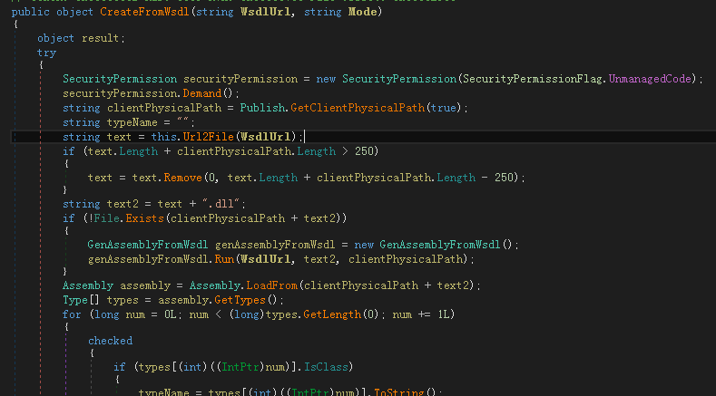 接着调用ClrObjectFactory类中的CreateFromWsdl()方法,该方法中会对WsdlURL进行解析,然后通过GenAssemblyFromWsdl()生成一个以URL作为名字的dll,将其load到内存中: