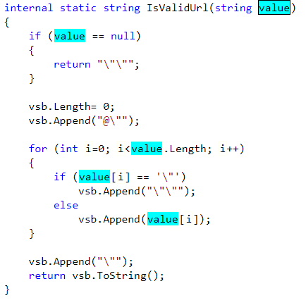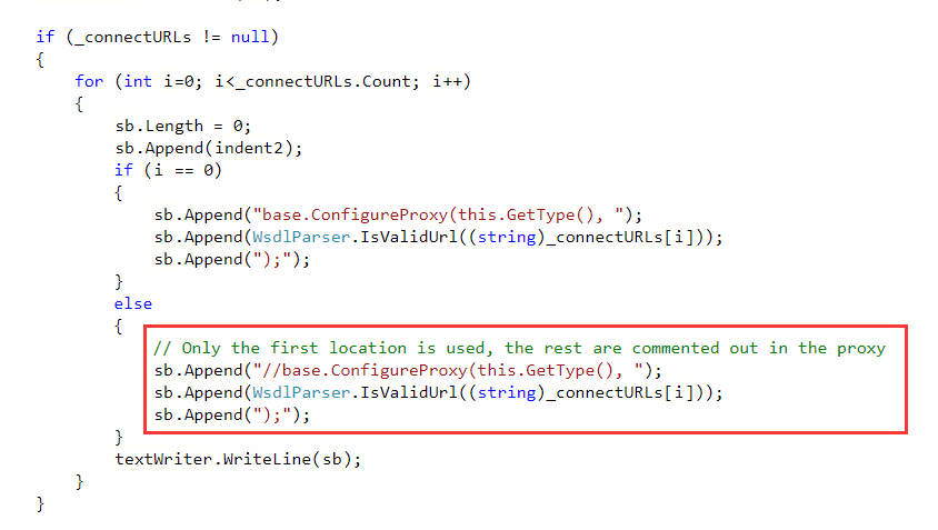 而漏洞正是出现在GenAssemblyFromWsdl()中对Wsdl解析的时候,SOAP WSDL 解析模块WsdlParser的 IsValidUrl() 函数没有正确处理可能包含的回车换行符,使调用IsVailidUrl的PrintClientProxy没能注释掉换行符之后的代码,从而导致了代码注入。相关的漏洞代码如下: