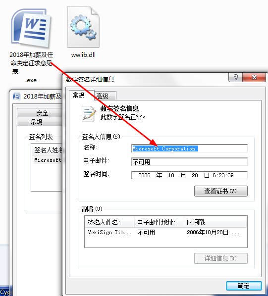 把压缩包解压以后,可以看到其中包含一个名为 “2018年加薪及任命决定征求意见表 .exe”的可执行程序,这个程序其实就是一个正常微软的WINWORD.exe 的主程序,带有微软的签名,所以其WinWord的图标也是正常的: