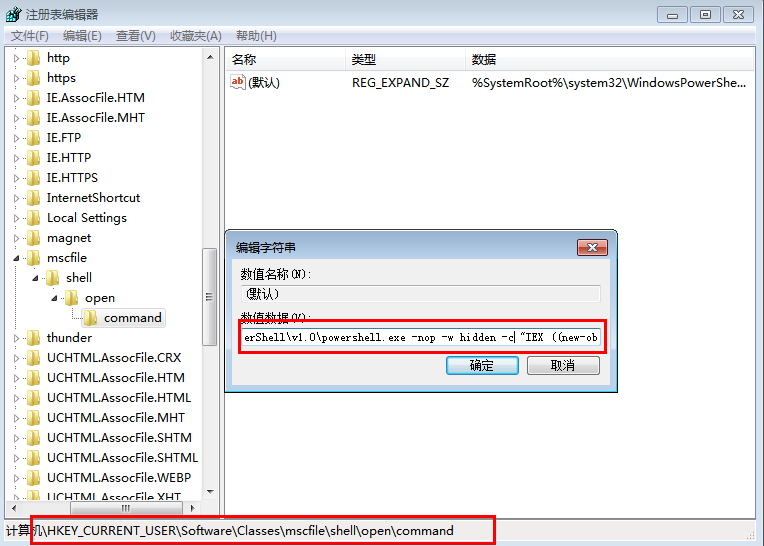 检查相关的注册表项,发现被修改指向了Powershell,这是一种已知的绕过UAC的技巧,我们在下节详细介绍一下。