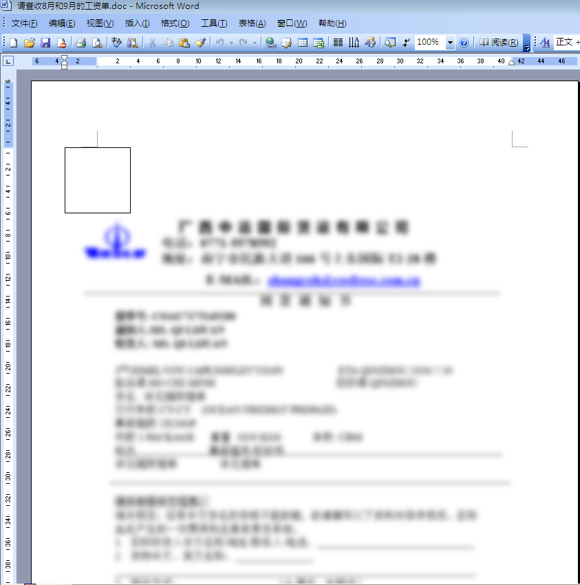 打开文件会发现其并没有内容,而只是显示了一个空白框和一张模糊不清的图片,显然这是一种企图引诱用户点击打开漏洞文档,然后通过漏洞在系统后台运行恶意代码的社会工程学攻击。