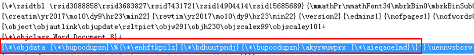 样本文件中的Payload被设置在objdata对象中,可以看到其数据是被混淆过的: