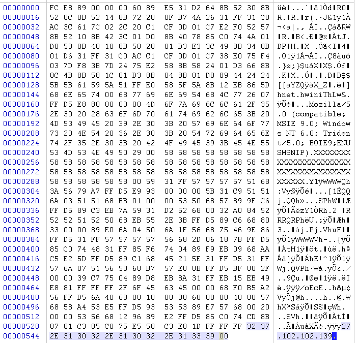 Shellcode会连接https://27.102.102.139/oEcE地址下载下一步攻击荷载,而oEcE就是前面分析的CobaltStrike的释放Beacon模块的Shellcode:
