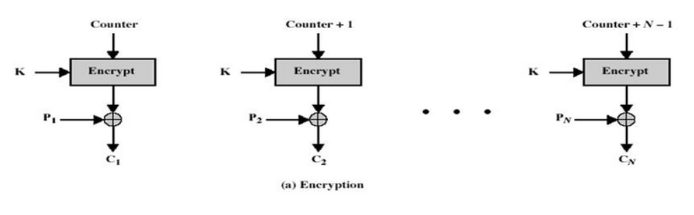 计算器模式不常见,在CTR模式中, 有一个自增的算子,这个算子用密钥(K)加密之后的输出和明文(P)异或的结果得到密文(C),相当于一次一密。这种加密方式简单快速,安全可靠,而且可以并行加密,但是在计算器不能维持很长的情况下,密钥只能使用一次。