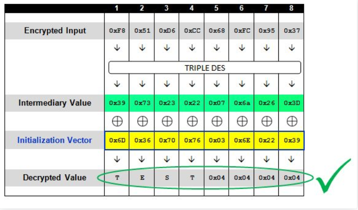 这里从freebuf借来一张图,上图简单的概述了”TEST”的解密过程,首先输入密码经过加解密算法可以得到一个中间结果 ,我们称之为中间值,中间值将会和初始向量IV进行异或运算后得到明文
