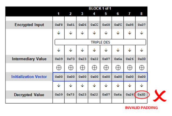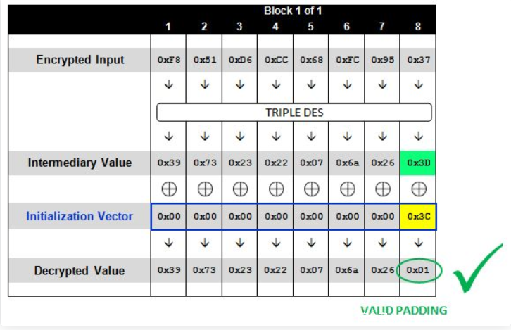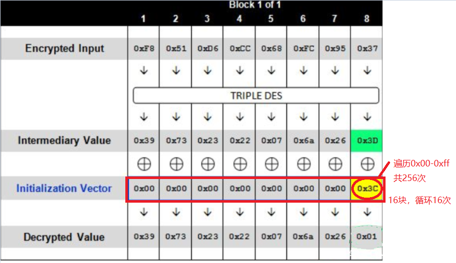 在这个情况下,我们便可以推断出中间值(Intermediary Value)的最后一个字节,因为我们知道它和0x3C异或后的结果为0x01,于是: