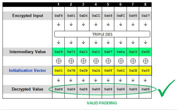 - 接受到非法的密文之后(解密后发现填充不正确),应用程序抛出一个解密异常(500 – Internal Server Error)。