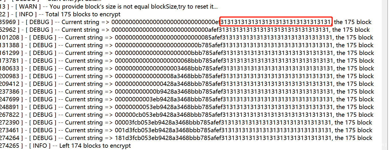 logger.debug(String.format("Current string => %s, the %d block", ArrayUtil.bytesToHex(ArrayUtil.mergerArray(tmpIV, nextCipherTextBlock)), this.encryptBlockCount));