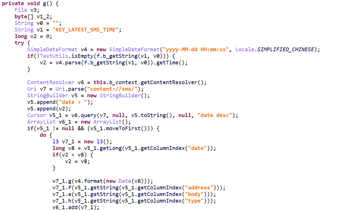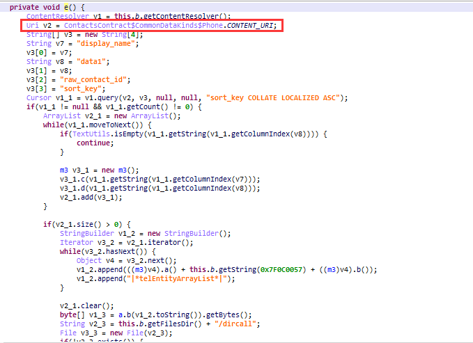 恶意程序运行主要分为两大功能,第一种功能会仿冒金融结构,诱导用户填写个人信息,利用提示信息诱骗用户拨打电话联系咨询员,并自动监听手机通话状态,利用黑名单来自动挂断指定号码;第二种功能会获取个人敏感信息,包括用户通讯录、短信、通话记录等个人信息上传到指定服务器,还会获取用户保存在SD卡上的各种文件(如doc、xlsx、pdf等),并且有意识的收集韩国本土办公软件的文件(如hwp类型);该软件还留有远控模块,方便日后升级与持续获取信息。