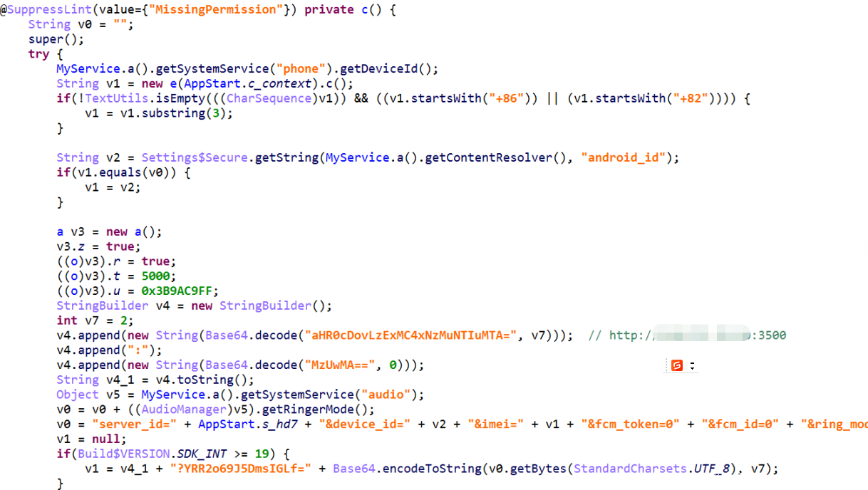 (3)获取手机号码等固件信息经过BASE64加密后进行上传: