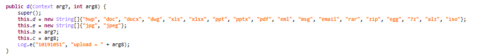 (1)程序会在SD卡中搜索hwp、doc、docx、dwg、xls、xlsx、ppt、pptx、pdf、eml、msg、email、rar、zip、egg、7z、alz、iso格式的文件进行上传。