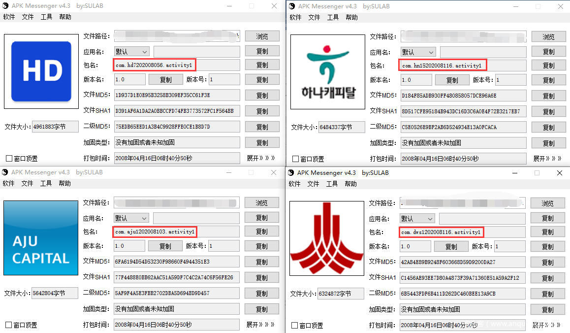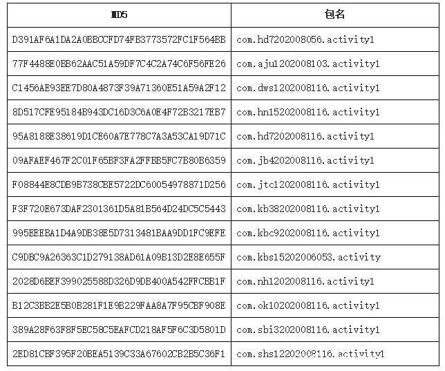 此次活动,利用的样本包名相似度极高,具有一定的命名规律,都会包含要仿冒的金融机构的缩写和一串数字组成: