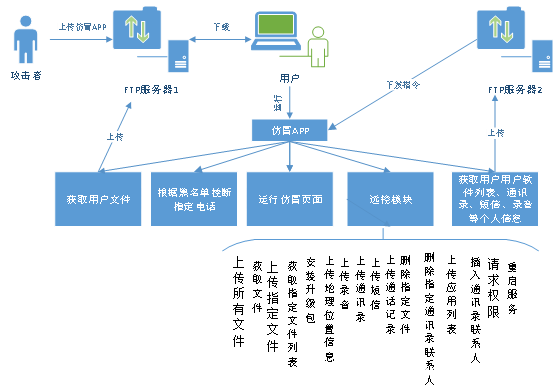 (1)程序通过FTP服务器,将获取的用户短信、通讯录、通话记录、录音文件加密后进行上传。