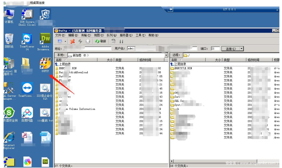 目前把一部分该拿的分拿了,该回到第一台机器上翻翻垃圾堆,说不定有一些其他的面包屑信息可以帮助你再进一步渗透。在A机器上发现有一个8uftp,直接连进去发现了靶标系统主站A,