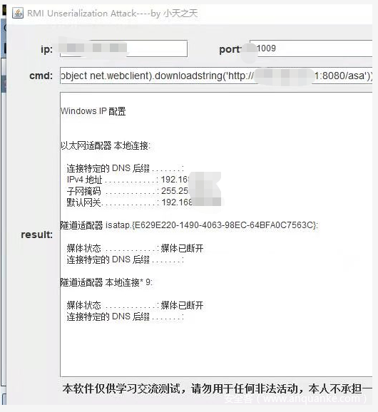 快速对信息收集报告扫了一眼,发现一处x1099端口对应java rmi服务,这说明好的渗透测试皆是基于信息收集做的好,作为一个三年渗透经验的安服仔,立即联想到之前Java RMI存在反序列化漏洞CVE-2017-3241,掏出大佬写的工具。