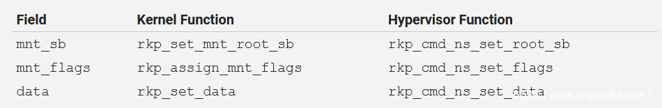 当内核在fs/namespace.c的alloc_vfsmnt中分配一个新的挂载命名空间时,会对RKP进行调用,以初始化struct vfsmount的反向指针。