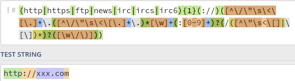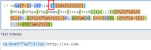 通过上面测试可知,整一句正则的作用为:先匹配 a标签,匹配不到就去匹配 url。注意 url 前面需要有一个空格或者特殊符号