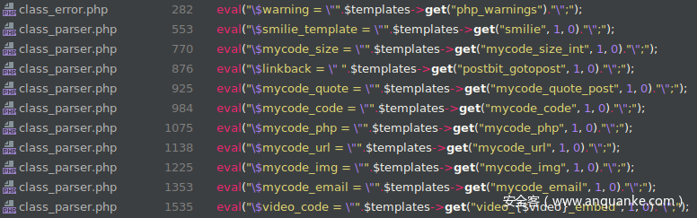 接着追踪到 class_parser.php:456, postParser->parse_mycode() 。