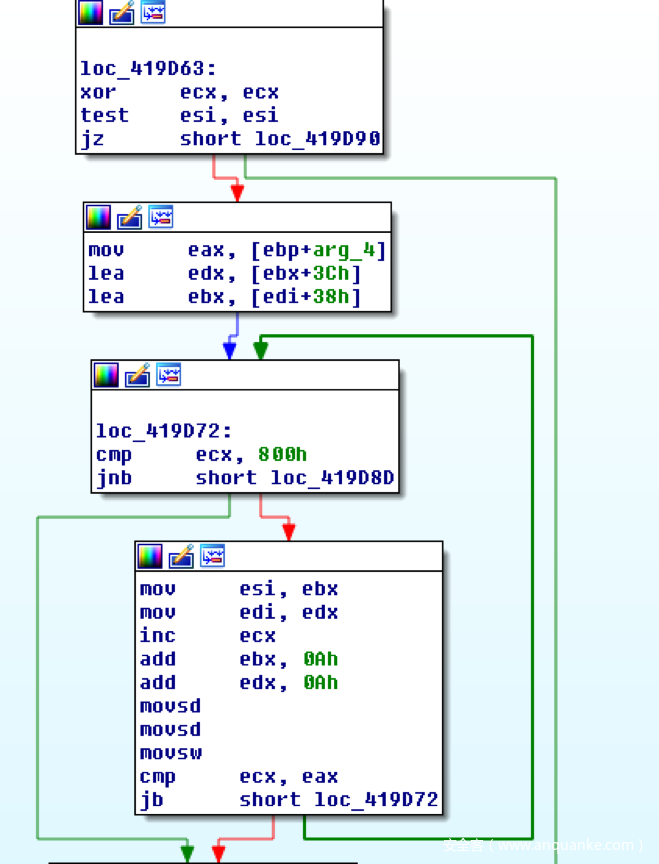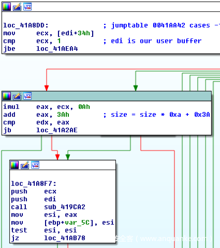跟之前存在安全漏洞的代码有很大的区别,从我们用户空间传递过去的值将存储在ecx寄存器中,然后以参数的形式传递给sub_419CA2。而在sub_419CA之中,我们可以看到用户模式缓冲区被引用了很多次,而真实的空间大小值(位于user_buff+0x34)并没有被获取过。