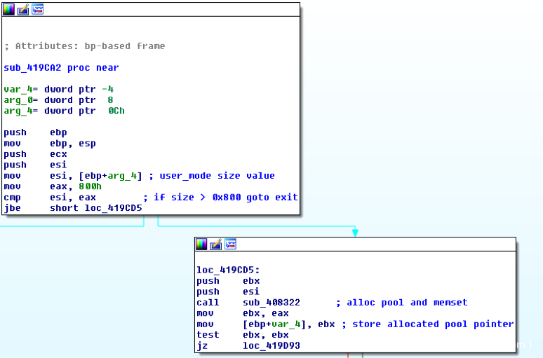 比如说,我们可以看看函数的起始部分,被推入栈中的参数已经被访问了,而这个参数是我们在用户模式下无法完全控制的。除此之外,空间大小值(0x800)已经被硬编码存储了,这样也修复了我们之前所提到的整形溢出问题。