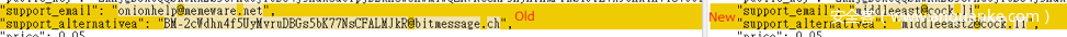 我们还发现在同一个版本的配置数据中存在不同的电子邮件,因此我们相信这两个样本可能由不同的开发者编译。在这个样本中我们只找到了middleeast[@]cock.li这个邮箱,而本文中我们分析的其他样本中的邮箱都为onionhelp[@]memeware[.]net。