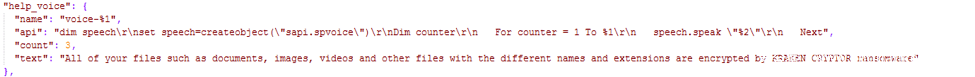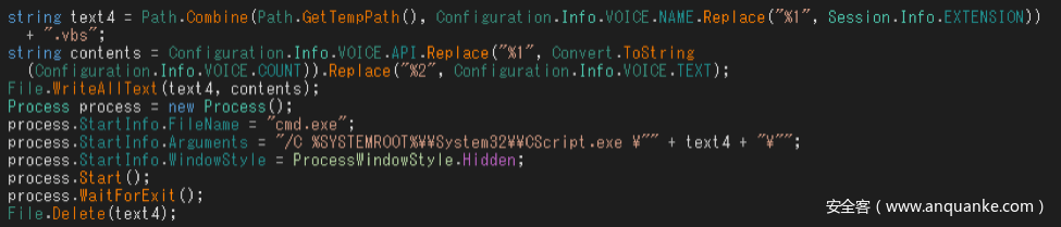 通过这个配置文件,恶意软件会使用CScript来执行生成的Visual Basic脚本文件(.vbs),脚本文件的内容位于API标志中。运行脚本文件后,恶意样本会语音念出配置数据中预置的文本内容。