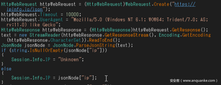 找到存在bug的这个样本后,我们又在几个小时之后发现了标记为2.1版的另一个样本,其中删掉了我们刚刚发现的bug。然而,这个版本中包含另一个错误,在获取地理位置的函数中存在一个逻辑异常处理问题,导致离线安装功能被禁用。这个函数会连接到ipinfo[.]io/json来获取系统的地理位置信息。如果无法建立连接,则会捕获到异常,然后不会为地理位置变量赋任何值,导致读取配置数据失败。因此,这个版本只能在在线环境中运行。