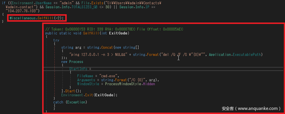 我们还在这两个新版本中找到了另一个有趣的检查过程。Kraken现在会检查特定的用户名、特定的文件甚至特定的IP或者国家代码。如果满足这些条件,恶意软件会停止感染系统,执行自删除操作。
