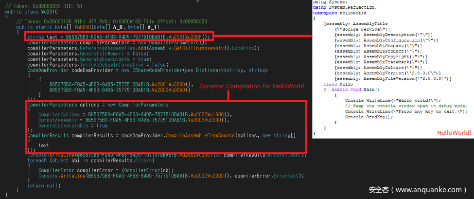 现在样本中添加了经过动态编译和执行的一个HelloWorld!示例源码。开发者貌似正在把玩源代码。