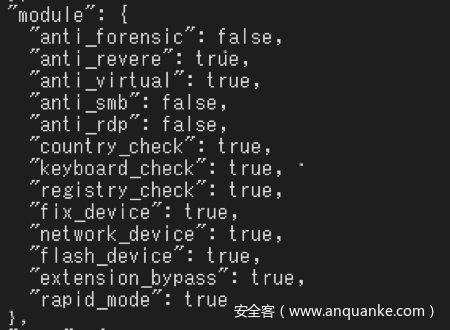 module标签内容与2.04版存在较大不同,如下图所示。开发者从2.07版开始删除了反分析模块中关于smb及rdp方面的配置。这些配置最早源自于2.04版,恶意软件使用smb以及rdp标签来阻止被感染环境使用smb及rdp连接。然而,我们没有在2.1及2.2版中找到这些功能。
