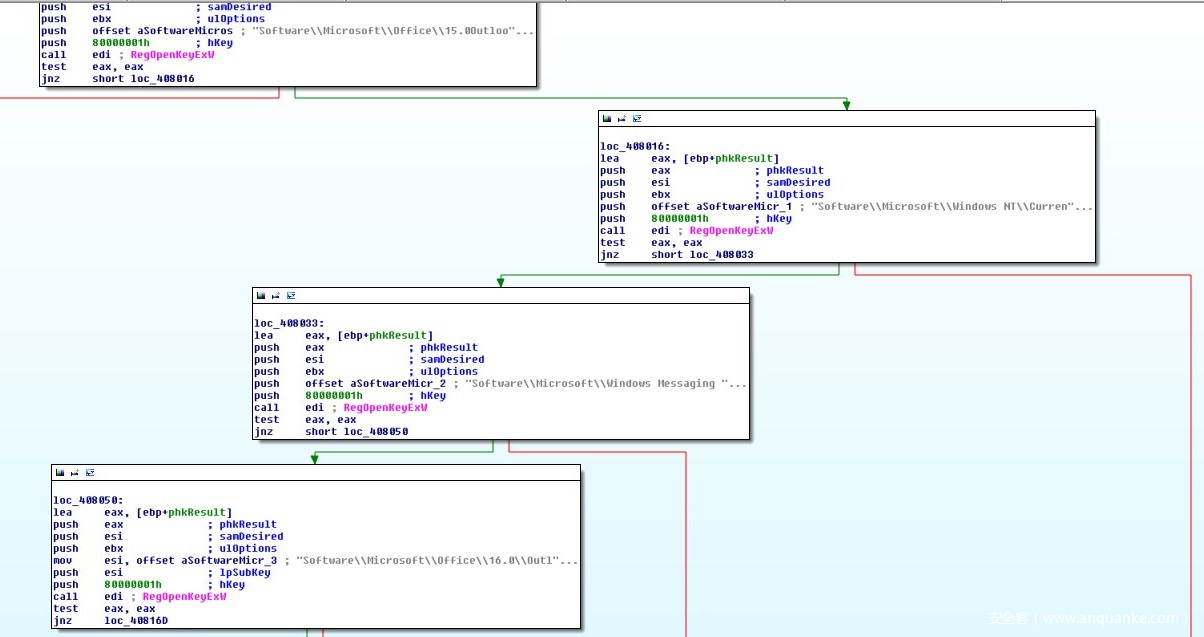 静态分析显示恶意软件会查找已安装的邮件客户端(比如Microsoft Exchange Client或Outlook)以窃取受害者的凭据。