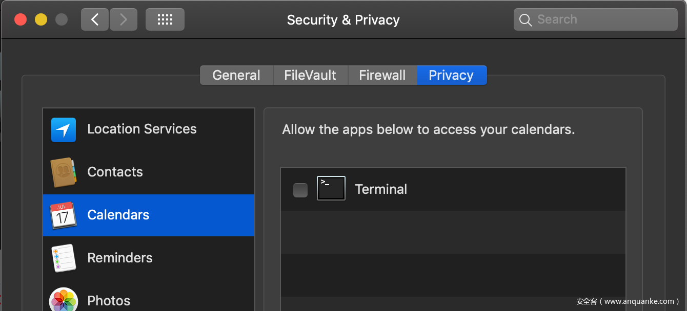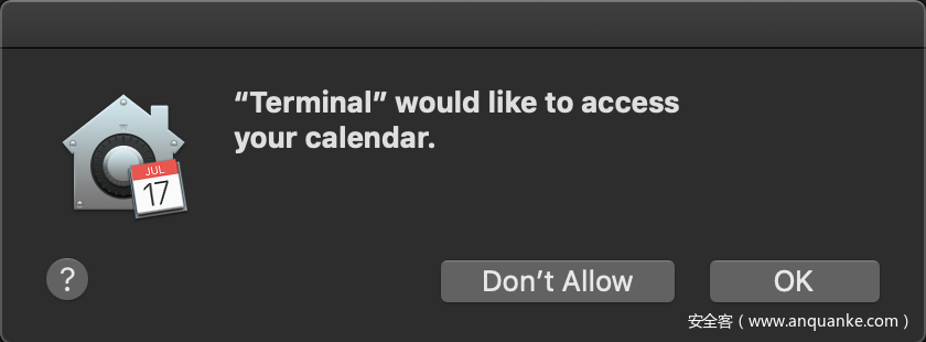 如果之前我们没有允许Terminal.app访问日历(如果先前已经允许,那么也可以通过tccutil reset Calendar来恢复设置),我们就会看到如下警告框:
