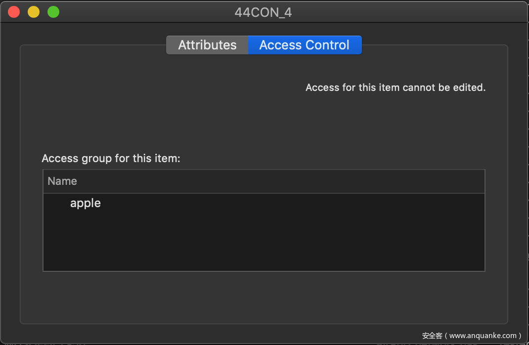 观察可用的iCloud keychain,我们可以看到其中存储了一些项目,比如WiFi凭据,这里绑定了apple访问组权限,可以在不弹框的情况下获取凭据信息。
