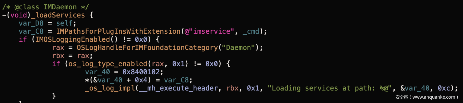 我们可以搜索对NSBundle的引用,很快就能找到_loadServices方法,其中包含如下代码: