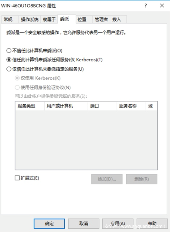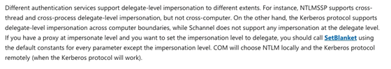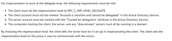https://docs.microsoft.com/en-us/windows/win32/com/impersonation-levels 如果客户端采用SECURITYDELEGATION权限连接服务端,则允许服务端任意模拟客户端权限,包括本地和远程认证,但是根据官网文档,服务端要接受SECURITYDELEGATION权限的委派,服务端需要满足以下条件