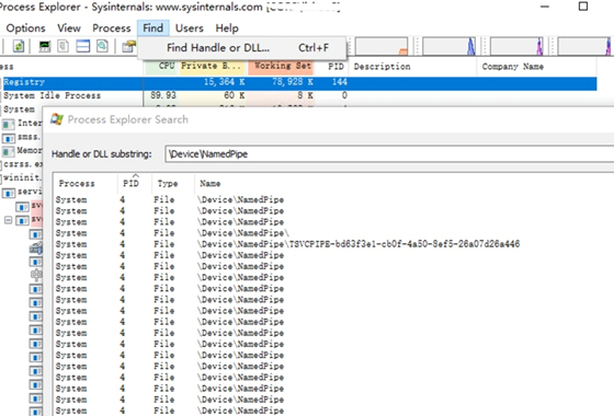 通过Process Explorer的Find-Find Handle or DLL功能查找名为\Device\NamedPipe
