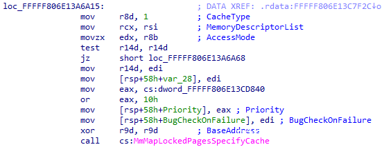 传递给MmMapLockedPagesSpecifyCache的第1个参数为指向MDL结构的一个指针,该结构在前文提到的步骤2中分配。
