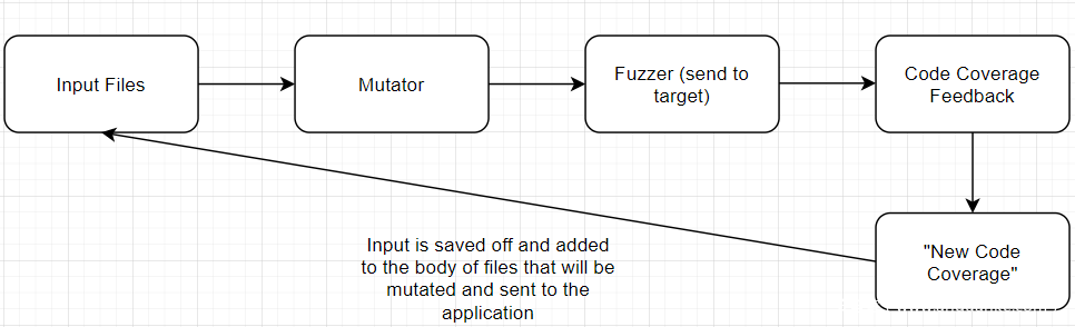 一般来说,模糊测试器中的代码覆盖跟踪系统会记录哪些输入覆盖到了程序中新的代码范围。存在很多方法达到该目的。如果拥有源代码,你就可以使用其他工具对其进行重新编译,在到达新的代码范围的时候通知模糊测试器。@gamozolabs发布了一个非常棒的Windows用户域代码覆盖系统,该系统中使用了一个运行速度极快的调试器,它会在目标二进制文件中设置数百万个断点,并在到达每个断点时慢慢对断点进行删除,该工具叫做‘mesos’。 一旦模糊测试器发现某个变异的输入到达了新的代码范围,就会将其保存下来,以便接下来重复使用,或者进一步进行变异从而覆盖更多代码范围。下图进行了一个简单的解释,但希望解释得足够清晰。